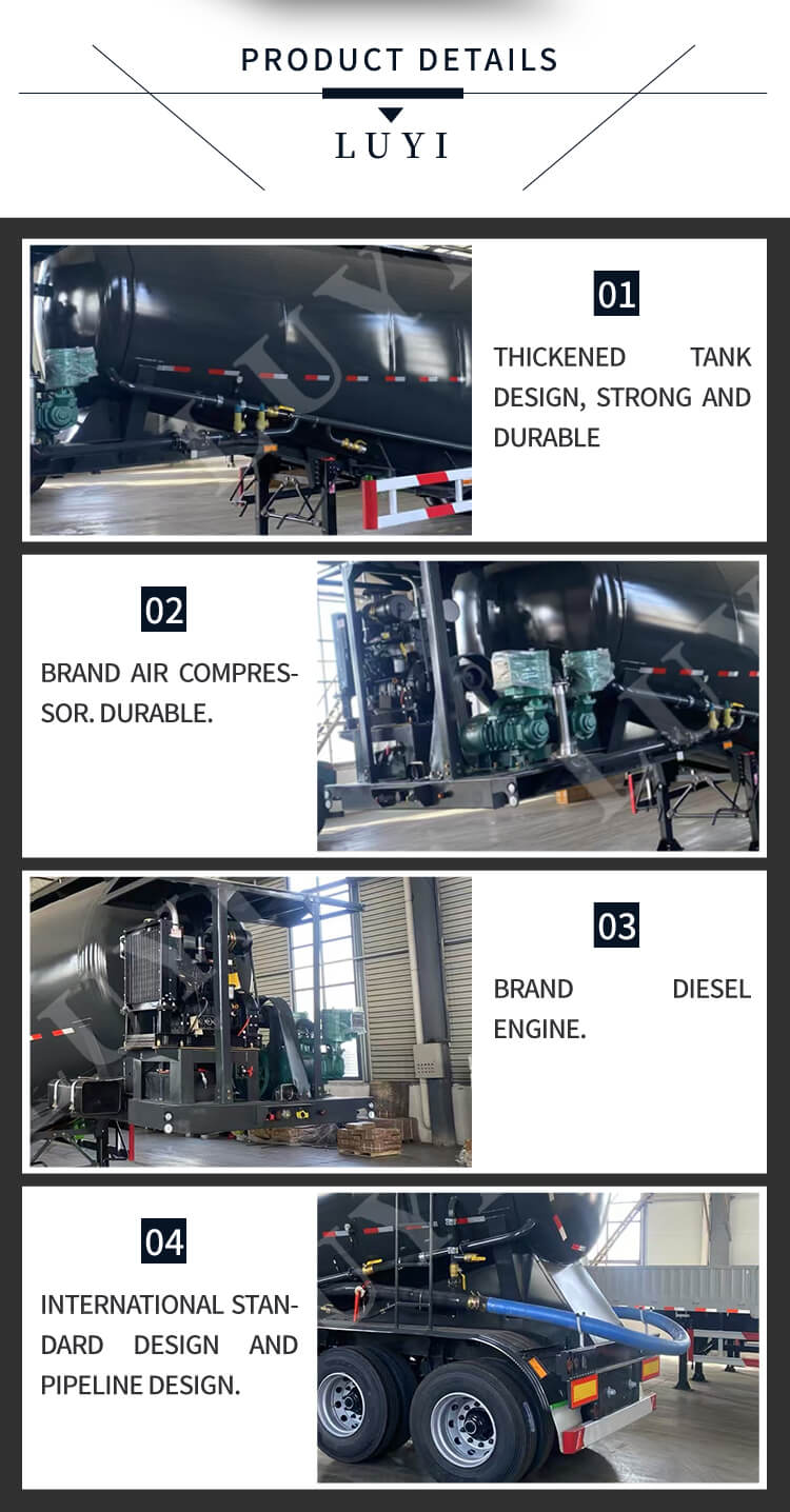 Il semirimorchio cisterna di cemento Luyi a 3 assi da 35 metri cubi, originario della provincia di Shandong, Cina, è un semirimorchio di alta qualità costruito appositamente per il trasporto di cemento sfuso. Ha una capacità di carico di 80 tonnellate, un carico effettivo che va da 60 a 80 tonnellate e un carico effettivo massimo di 80.000 kg, che può soddisfare in modo efficiente le esigenze di trasporto di grandi volumi.
