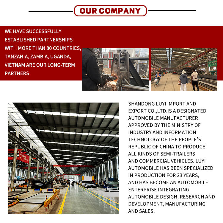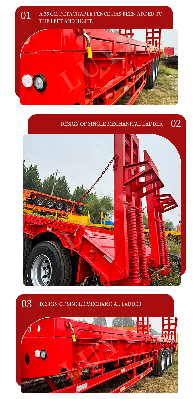 Dotato di assali premium 13T/16T (opzionali da LUYI, BPW o FUWA) e abbinato a sistemi di sospensioni meccaniche o pneumatiche, il rimorchio garantisce un funzionamento stabile e affidabile. La molla a balestra a 10 strati (90 mm di larghezza e 13 mm di spessore) abbinata al sistema frenante a doppia linea garantisce prestazioni di frenata precise ed efficienti. Viene fornito di serie con carrello di atterraggio da 28 tonnellate e perno JOST da 2" (50 mm) o 3,5" (90 mm), compatibile con vari trattori. Con colori personalizzabili, questo rimorchio soddisfa perfettamente le esigenze di trasporto di tutti i tipi di carichi pesanti, rendendolo la scelta ideale nel settore della logistica e dei trasporti.