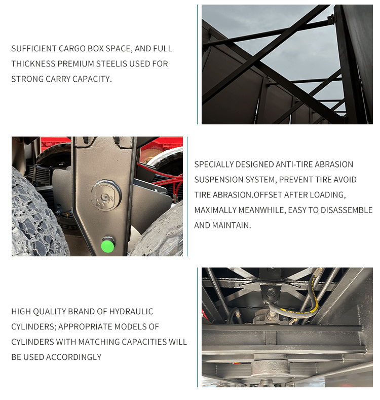 Con dimensioni di 11.000x2.500x3.500 mm e un carico utile massimo di 25.001-30.000 kg, soddisfa in modo efficiente le esigenze di carichi pesanti. È dotato di sospensioni meccaniche, molle a balestra da 90 (L) mm × 13 (Spessore) mm × 10 (Strato) e un sistema di frenatura a doppia linea per un funzionamento stabile e sicuro. Il carrello di atterraggio standard da 28 tonnellate e il perno centrale JOST da 2" (50 mm)/3,5" (90 mm) migliorano l'adattabilità. Il colore e il logo possono essere personalizzati, rendendolo una scelta versatile e affidabile per le esigenze di trasporto pesante.