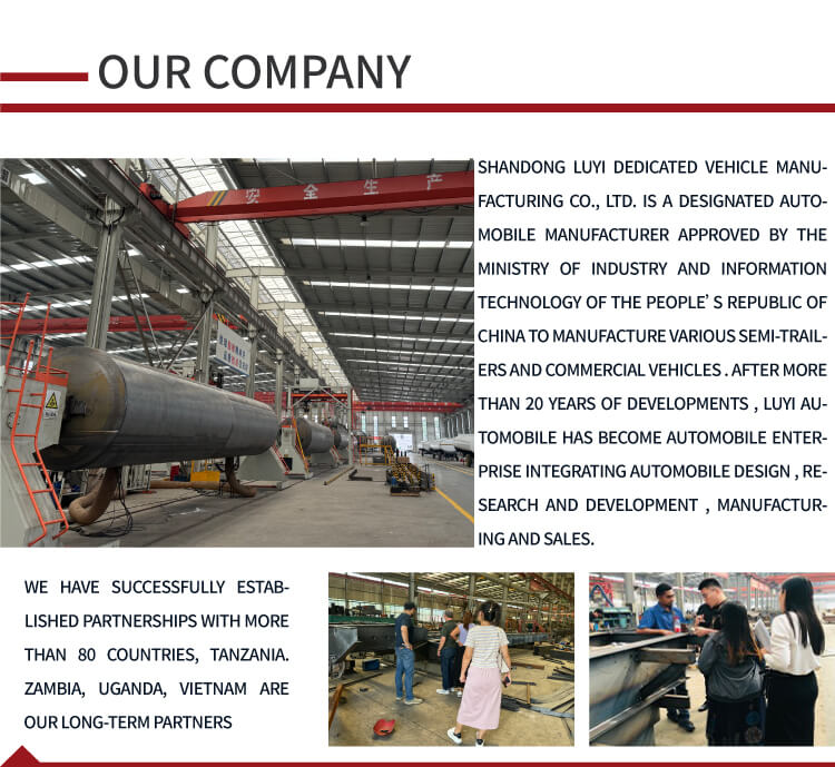 Il semirimorchio con serbatoio dell'olio da 40.000 litri LUYI a 3 assi in acciaio al carbonio, prodotto nella provincia di Shandong, in Cina, è un efficiente semirimorchio per camion per il trasporto di carburante. Costruito in acciaio al carbonio, è robusto e durevole, con un carico utile massimo effettivo di oltre 30.000 kg e una capacità di carico che varia da 20 a 60 metri cubi, in grado di soddisfare le diverse esigenze di trasporto di carburante.