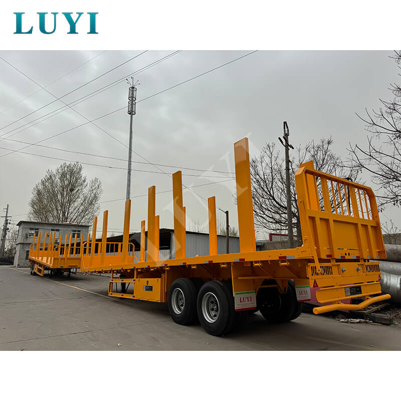 Il rimorchio a pianale a colonna a 2 assi da 40 tonnellate di LUYI è progettato su misura per il trasporto del legno con ampie opzioni di personalizzazione. Regola l'altezza della credenza (30-80 cm disponibili) per adattarla a tronchi, legname o altri prodotti in legno e scegli tra piastre in acciaio striato o piani rivestiti antiscivolo per una migliore presa.