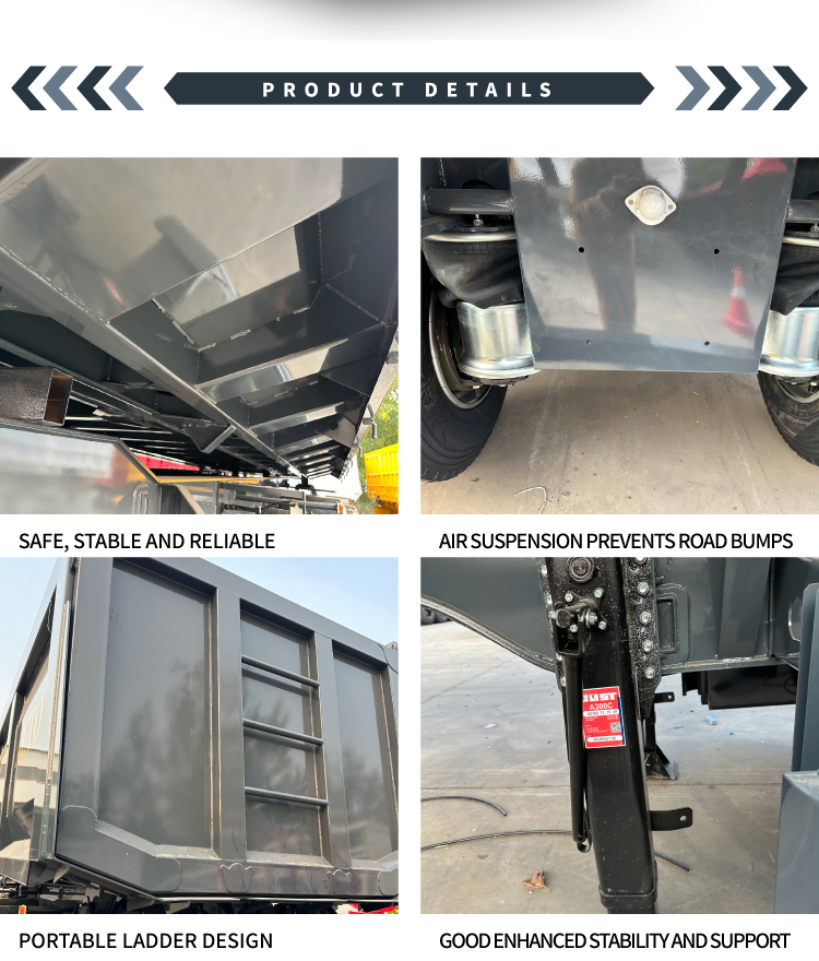 Questo semirimorchio con cassone ribaltabile a 3 assi con ribaltabile posteriore, caratterizzato da un rivestimento nero e da un design del cassone di carico rettangolare, è costruito appositamente per lo scarico automatico e il trasporto di materiali sfusi. È ampiamente applicabile in scenari come miniere, cantieri edili e trasporto di materiali da costruzione. La disposizione a 3 assi migliora significativamente la capacità di carico e la stabilità di guida, soddisfacendo perfettamente i requisiti di carico pesante e i limiti di conformità. Il cassone di carico rettangolare ha un volume regolare (25–42 m3), garantendo una maggiore efficienza di carico, e il telaio in acciaio ad alta resistenza garantisce la durabilità strutturale.