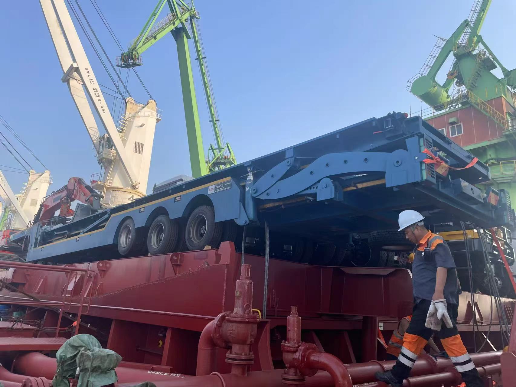 All’inizio dell’autunno, un porto internazionale nella provincia di Shandong era pieno di attività. Decine di LuyiSemirimorchi pianali a 3 assi da 4 piedierano parcheggiati in modo ordinato al terminal. Dopo aver attraversato molteplici procedure, come l'ispezione doganale e il rafforzamento della sicurezza, i semirimorchi a pianale sono stati lentamente sollevati nella stiva di una nave da carico oceanica mediante attrezzature di sollevamento professionali. Questa operazione di carico ha segnato il lancio ufficiale della cooperazione nel trasporto transfrontaliero tra il marchio Luyi e i clienti kazaki. I semirimorchi pianali Luyi a 3 assi e 4 piedi attraverseranno i confini nazionali per fornire soluzioni per carichi pesanti al settore dei trasporti tecnici in Kazakistan.